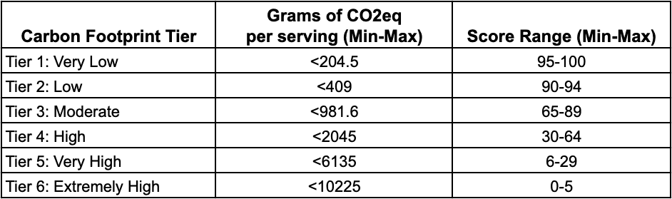 Points are deducted based on the number of grams of carbon dioxide equivalents emitted per serving of the product. The total carbon footprint of each product is assigned to one of six tiers and can tank as Very low, Low, Moderate, High, Very High, or Extremely High.