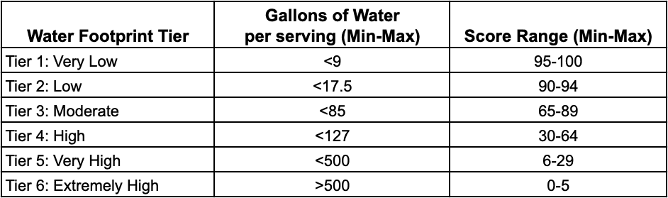 Using our proprietary method for analyzing the water footprint of a food or beverage product, the estimated water footprint of each product is assigned to one of six tiers and can rank as Very low, Low, Moderate, High, Very High, or Extremely High.