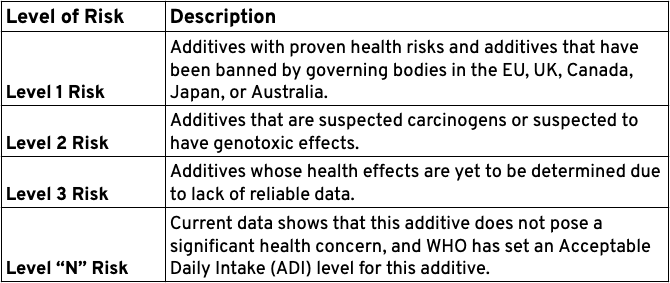 Based on the negative health effects each additive may cause, we classify the toxic additives into four levels: additives with a confirmed health concern, suspected carcinogens or suspected genotoxic additives, additives whose health effects are yet to be determined, and additives of no health concern. The four levels contribute to the base of our scoring system.