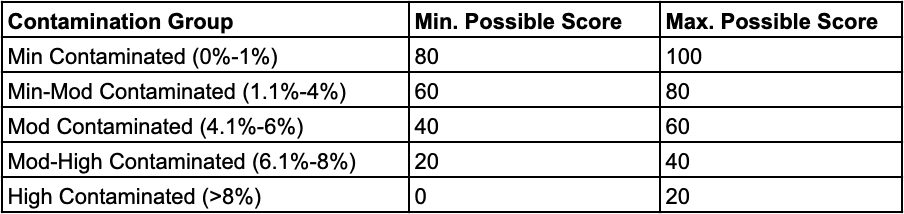 To determine the minimum and maximum possible score for products, commodities are assigned to one of five categories, based on the proportion of contaminated samples out of total samples tested over a period of 12 years.